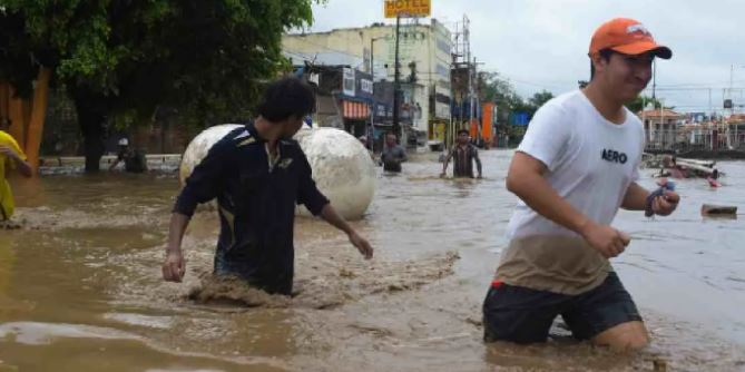 मेक्सिको के पॉज रिका में कैजोन्स नदी पूरे उफान पर है। नदी का पानी शहरों में घुस गया। पानी का बहाव इतनी तेज था कि कई कारें इसमें बह गईं और इमारतें धराशायी हो गईं।